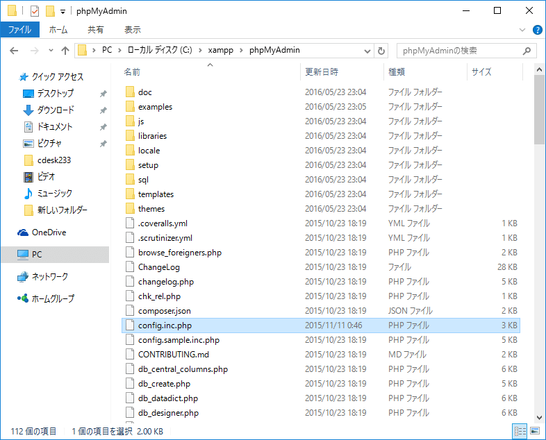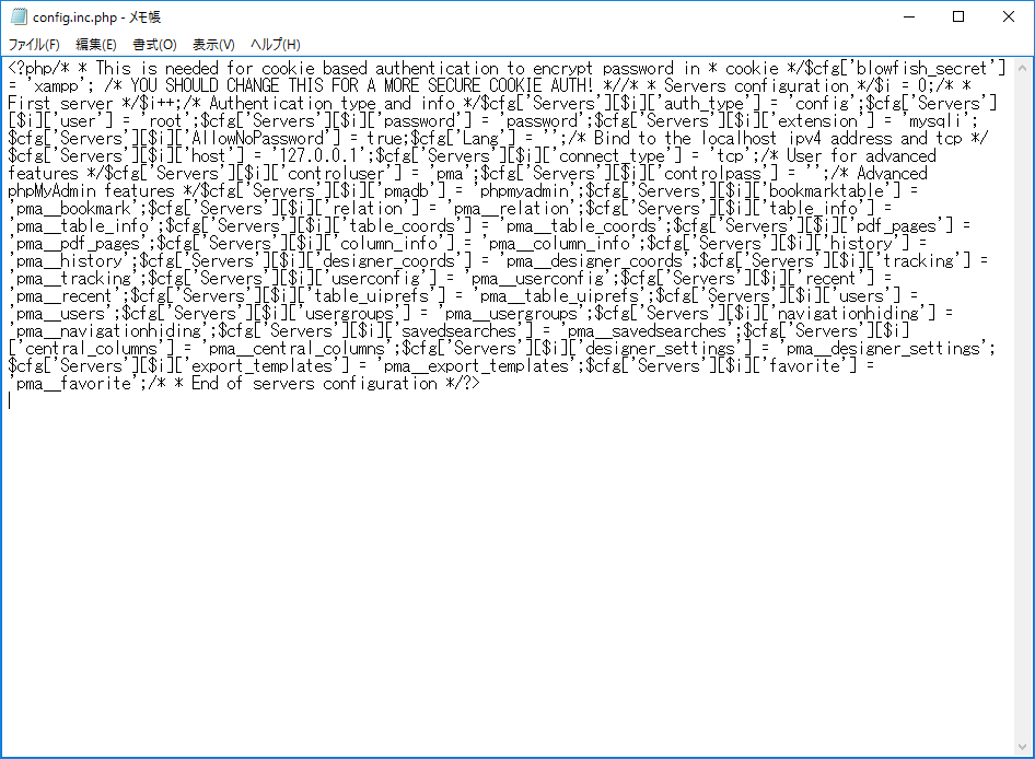 "c:\xampp\phpMyAdmin"フォルダにある"config.inc.php"ファイルを開きます。 ※サクラエディタなど文字コードをUTF8に指定して開けるエディタがインストールされている際はそのエディタで開くとわかりやすいです。