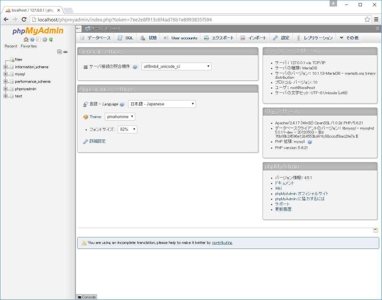以下の画面のようにphpMyAdminの画面が正常に開けばOKです。