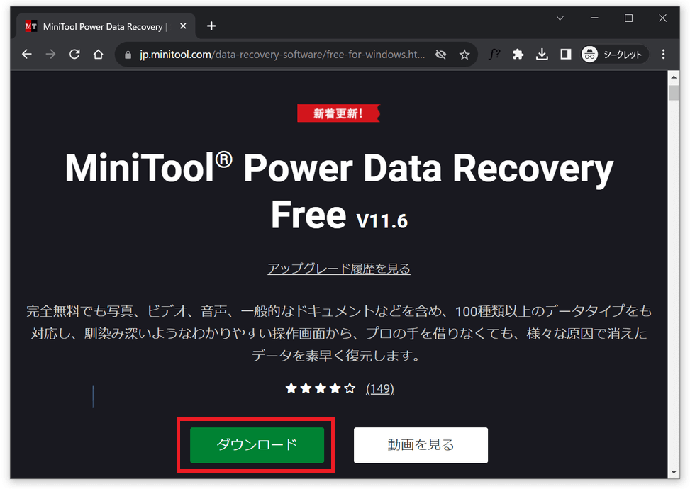 MiniTool Power Data Recovery Freeのダウンロードサイトを開き、[ダウンロード]をクリックしてインストールプログラムをダウンロードします。
