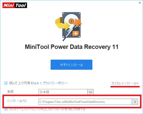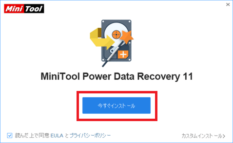 MiniTool Power Data Recovery Freeのインストールウィザードが起動するので[今すぐインストール]をクリックします。
