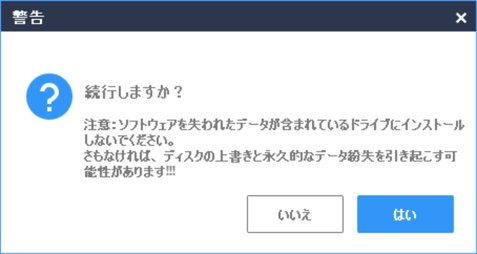 可能であれば復旧対象となっているドライブ以外にインストールすることをおすすめします。