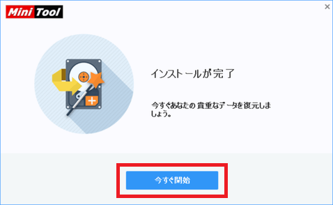 「インストールが完了」画面が表示されるので、そのままMiniTool Power Data Recovery Freeを起動する場合は[今すぐ開始]をクリックしてください。