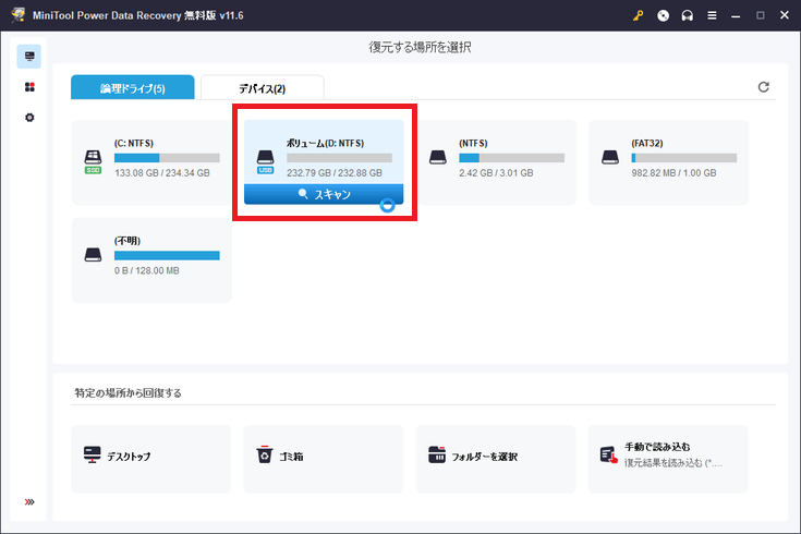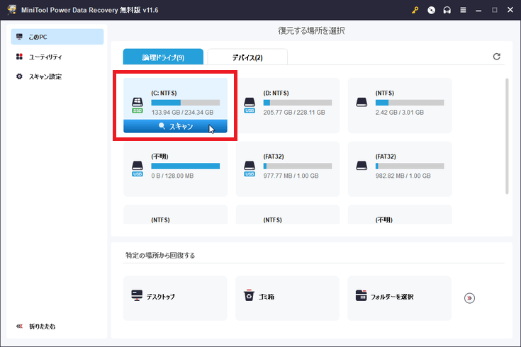 MiniTool Power Data Recovery Freeを起動して復旧したいドライブを選択して[スキャン]をクリックします。