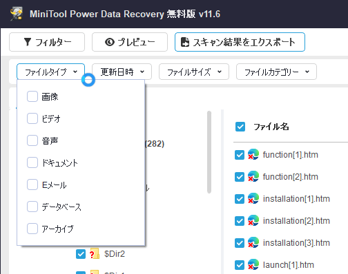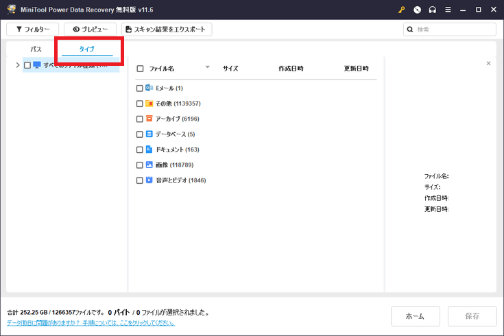 ファイルのタイプ別に表示できますので、復旧したいファイルの種類が限定できる場合は、[タイプ]をクリックしてファイルの種類別表示に切り替えたほうが復旧対象ファイルを探しやすいと思います。
