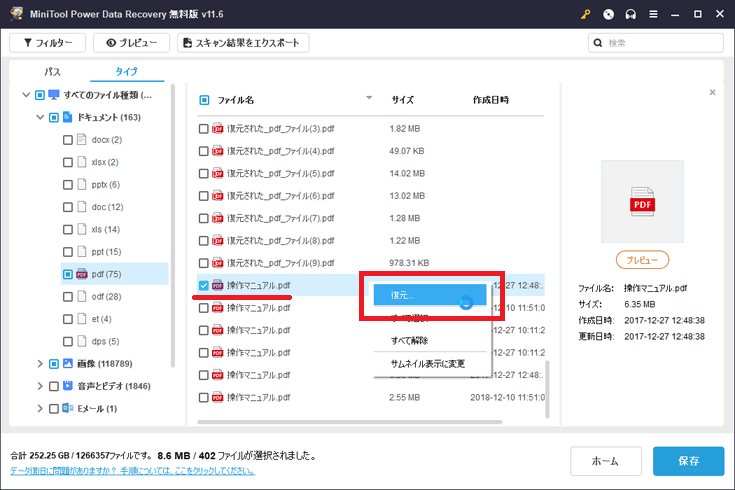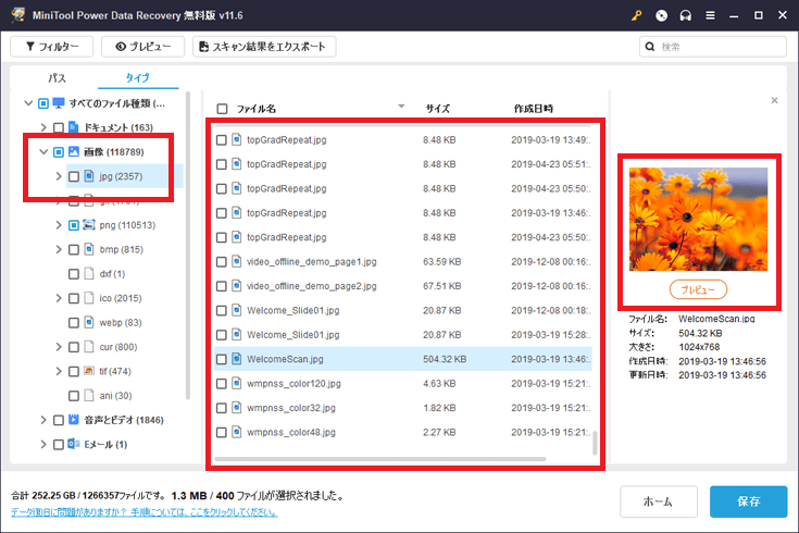 例えばjpgファイルを復旧したい場合は、[タイプ]表示から[画像] > [jpg]をクリックして、ファイルの一覧から復旧したいファイルをクリックします。