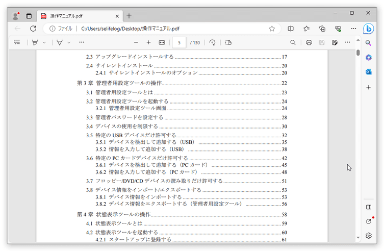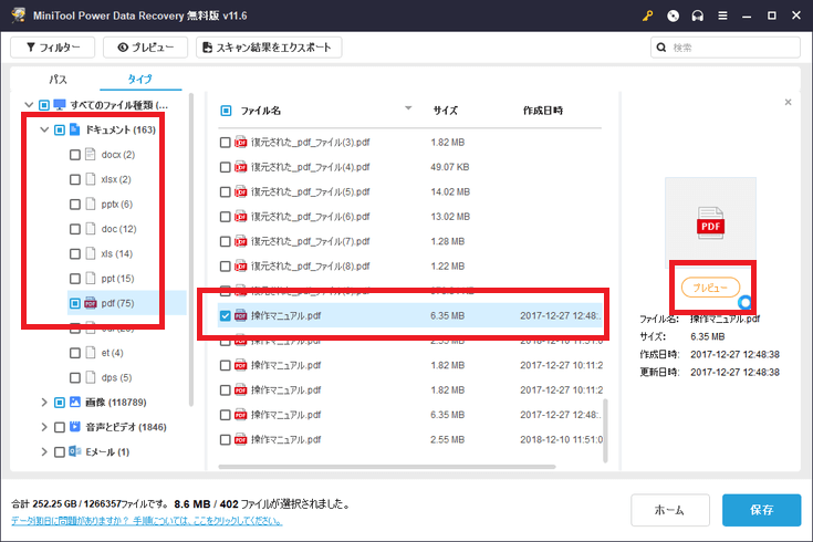 [タイプ]画面から[ドキュメント] > [pdf]をクリック、「操作マニュアル.pdf」を選択して[プレビュー]をクリックします。