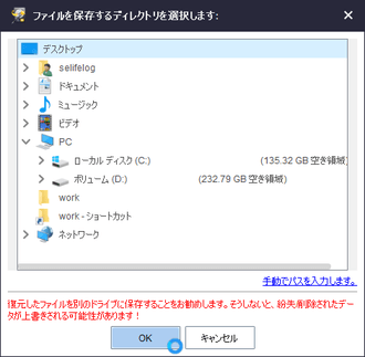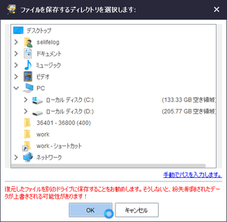 復元したファイルを保管するフォルダを選択して[OK]をクリックします。