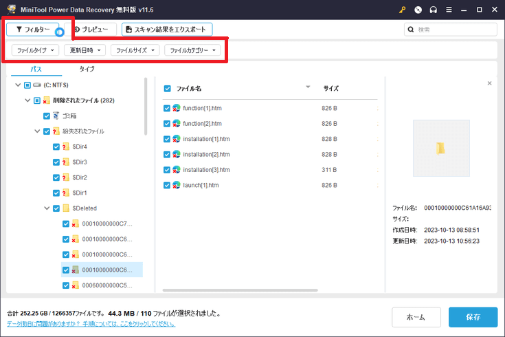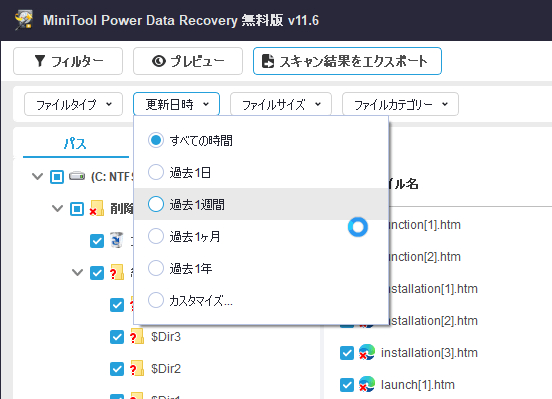 復旧したいファイルを見つけやすくするための「フィルタ機能」について説明します。