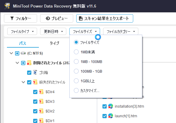 1MB 、1MB~100MB、100MB~1GB、1GB以上から選択、もしくはサイズを指定して絞り込みができます。