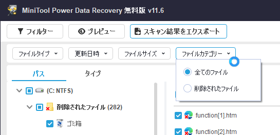 検索対象を全てのファイルとするか「削除されたファイル」のみとするか指定して絞り込みができます。