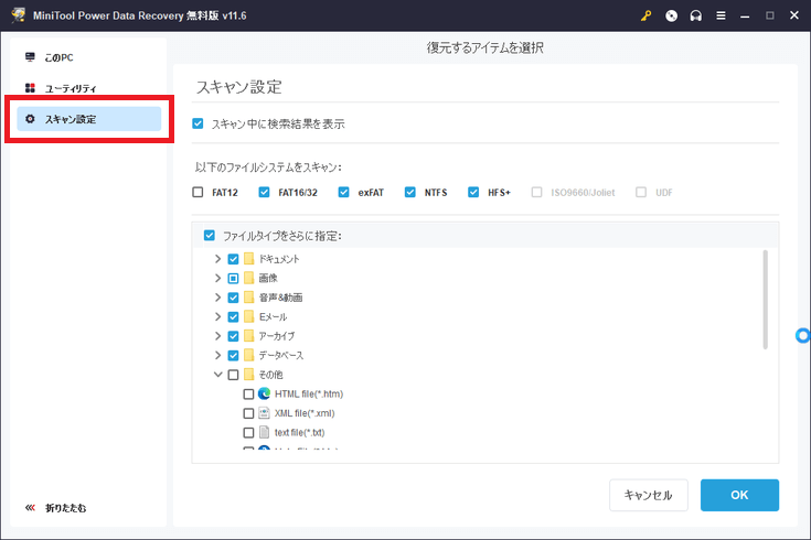 MiniTool Power Data Recovery Freeの画面の左のメニューから[スキャン設定]をクリックすれば設定画面が表示されます。