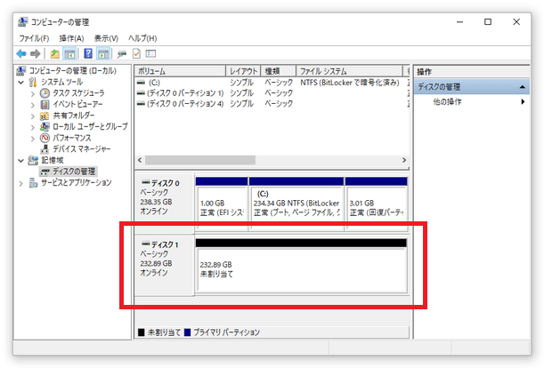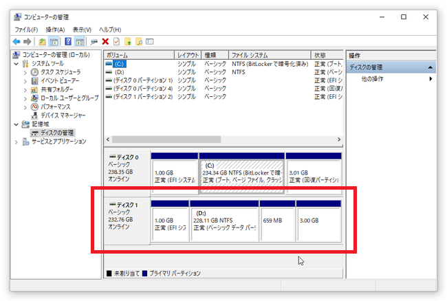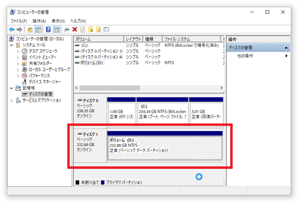 USB接続されたSSDドライブ(Dドライブ)のパーティションは以下のようになっています。