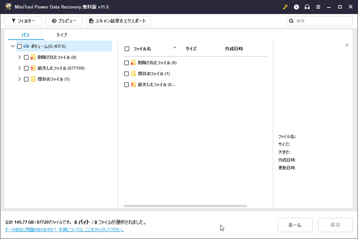 スキャンが完了し、スキャン結果では145.77GB、877,207ファイルが復旧されたと表示されています。