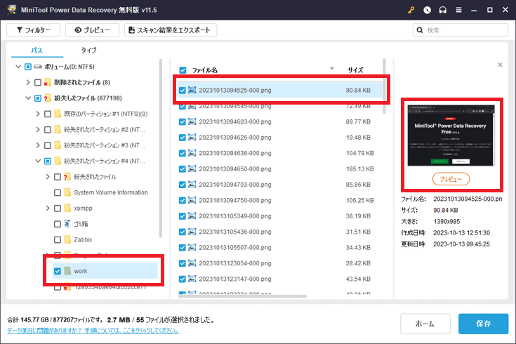 「紛失されたパーティション#4(NTFS)」上に存在することがわかったので、「work」フォルダのチェックをオンにします。
