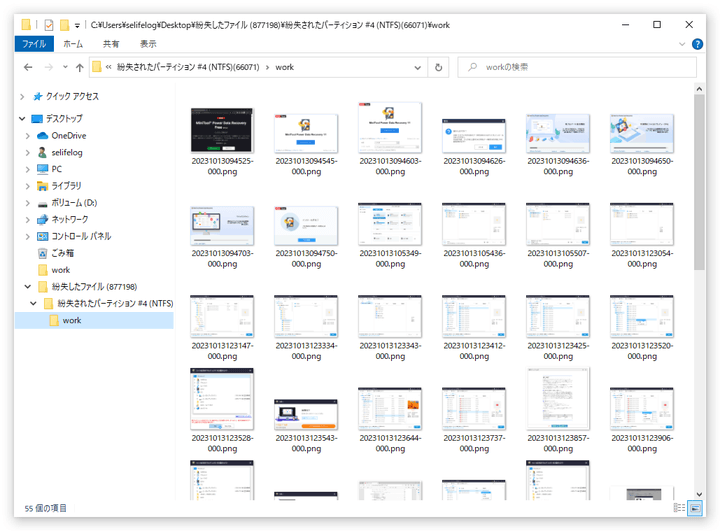 最後に一度パーティションを削除、フォーマットしたドライブからパーティション削除前に保存されていた「C:\work」フォルダを復旧できるか試してます。