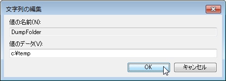 DumpFolderキーの値入力画面が表示されるので、"値"には、プロセスダンプを保存したいフォルダをフルパスで記載し、[OK]をクリックします。(例.c:\temp)
