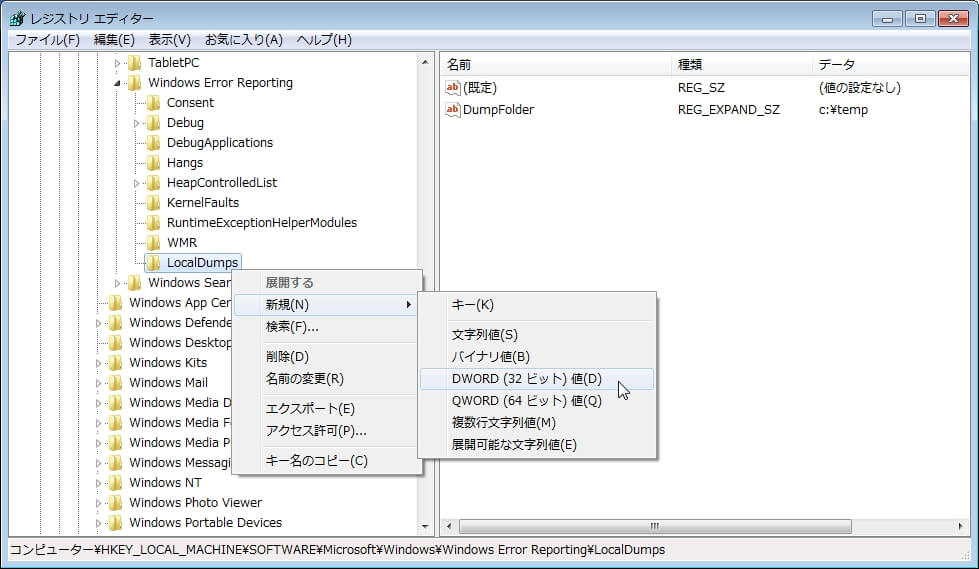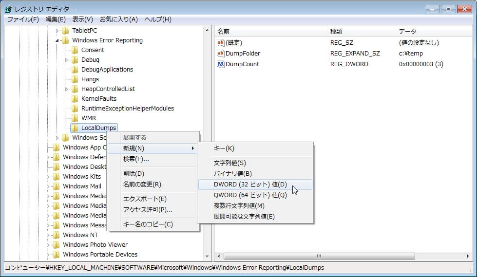 同じく[LocalDumps]キーを右クリックし、[新規] > [DWORD(32ビット)値]をクリックします。