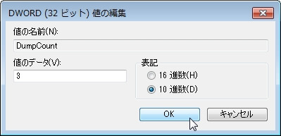 DumpCountキーの値入力画面が表示されるので、値にはプロセスダンプの保管回数を指定しますが、とりあえずここでは3(10進数)として[OK]ボタンをクリックします。