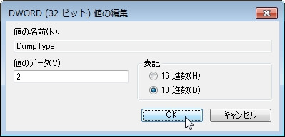 DumpTypeキーの値入力画面が表示されるので、値にはプロセスダンプの種類を指定します。