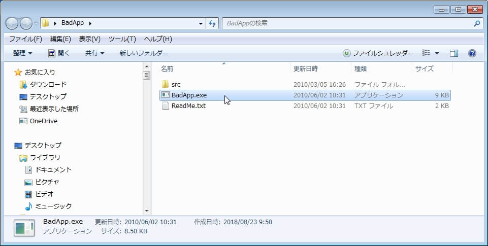 ダウンロードされたものは圧縮されているので解凍して、解凍したフォルダ内の"BadApp.exe"をダブルクリックします。