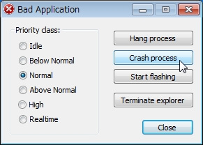 BadApp.exeを起動し、[Bad Application]画面が表示されるので[Crash process]ボタンをクリックします。