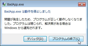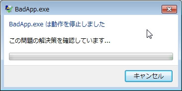 「BadApp.exe は動作を停止しました」と表示されるので、[キャンセル]ボタンをクリックします。