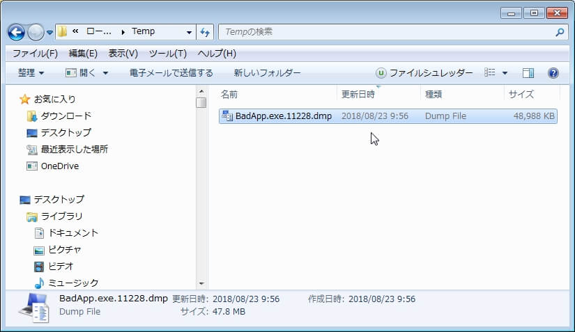 上記画面では、"BadApp.exe.11228.dmp"が作成されていることが確認できます。