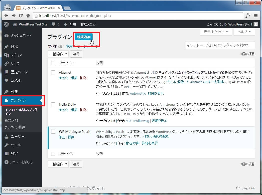 WordPressの管理画面左メニューから[プラグイン]をクリックし、[新規追加]をクリックします。