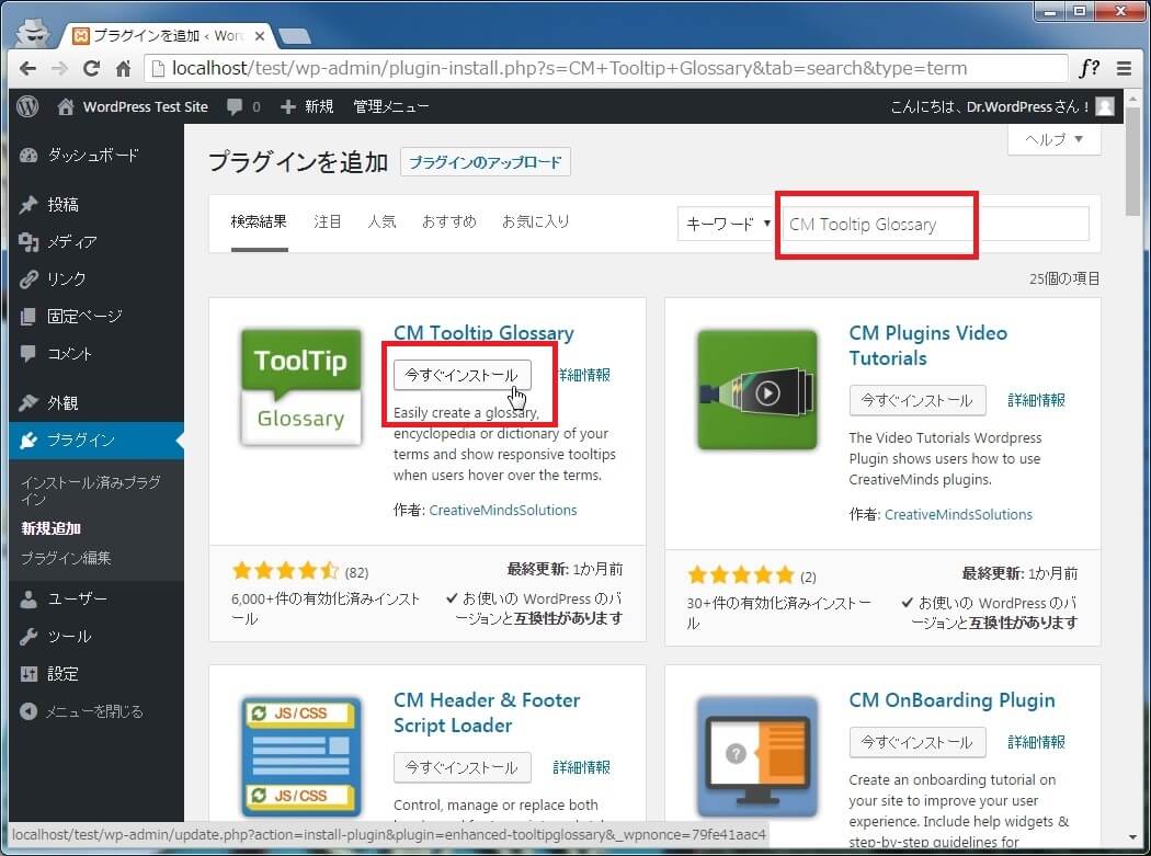 [キーワード]ボックスに"CM Tooltip Glossary"と入力するとプラグインの一覧に「CM Tooltip Glossary」が表示されるので[今すぐインストール]をクリックします。