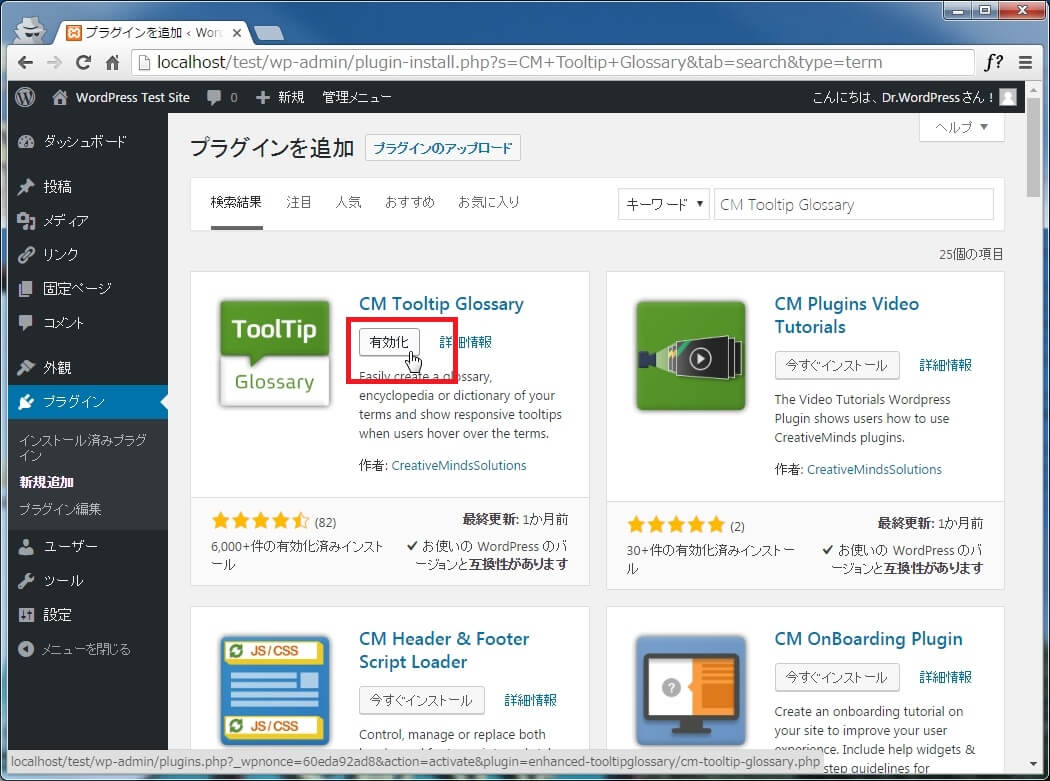 以下に「CM Tooltip Glossary」プラグインのインストールと有効化手順を記載します。