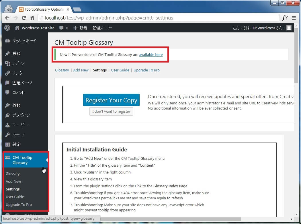 「CM Tooltip Glossary」のインストールと有効化