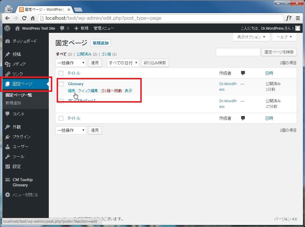次にWordPressの管理画面左メニューから[固定ページ]をクリックし、自動で作成された"Glossary"固定ページの[編集]をクリックします。