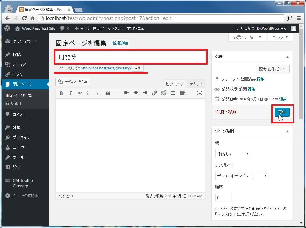 また、パーマリンクの設定が"http://URL/glossary/"になっていることを確認した上で、[更新]ボタンをクリックします。