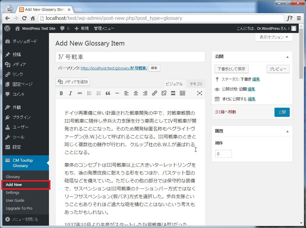 WordPressの管理画面左メニューに追加された[CM Tooltip Glossary]メニューから[Add New]をクリック、用語と用語の説明を記述し、[公開]をクリックして登録します。