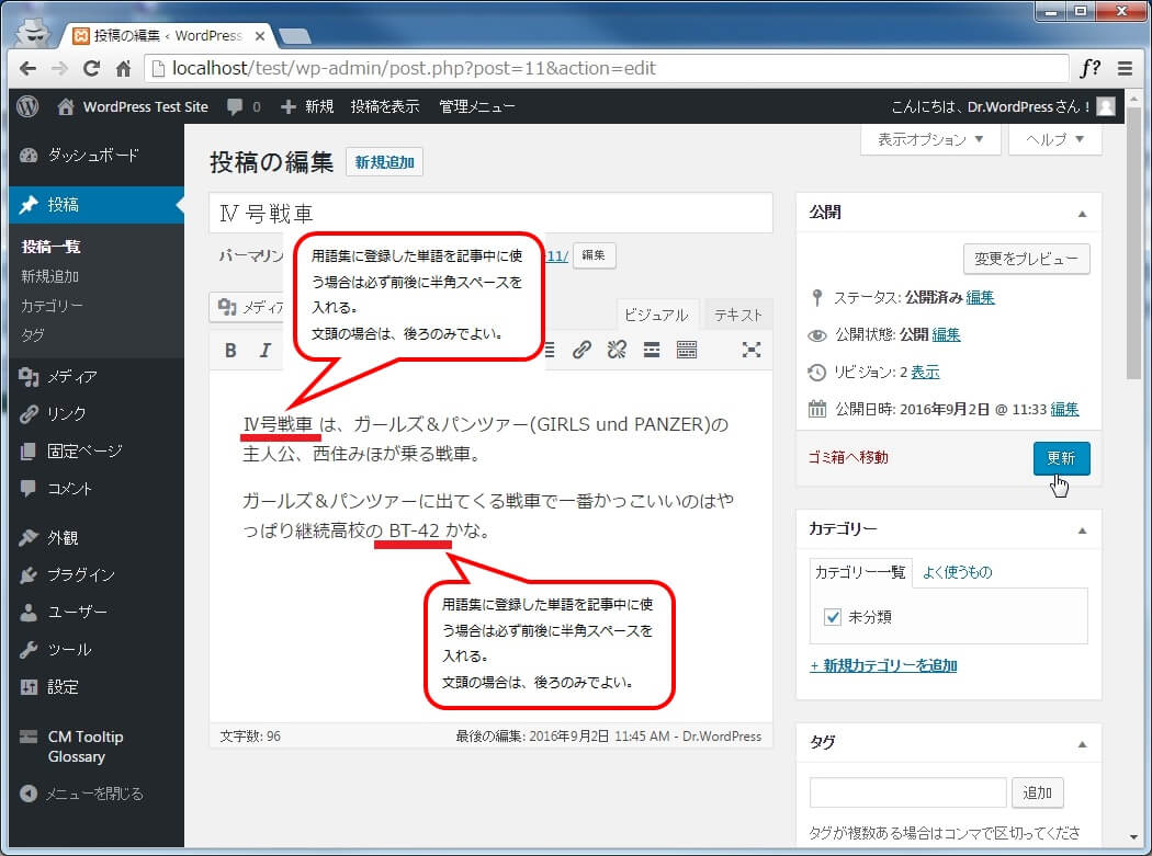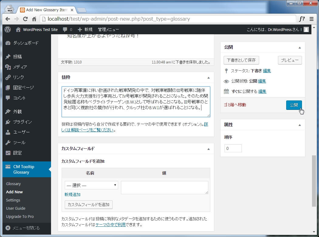 ツールチップで表示する解説文は短くシンプルにして、詳細は用語のリンクをクリックした際に表示される用語解説ページで表示するようなスタイルを取りたい場合は、[抜粋]欄を使うと良いです。