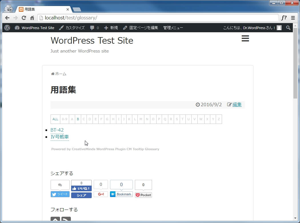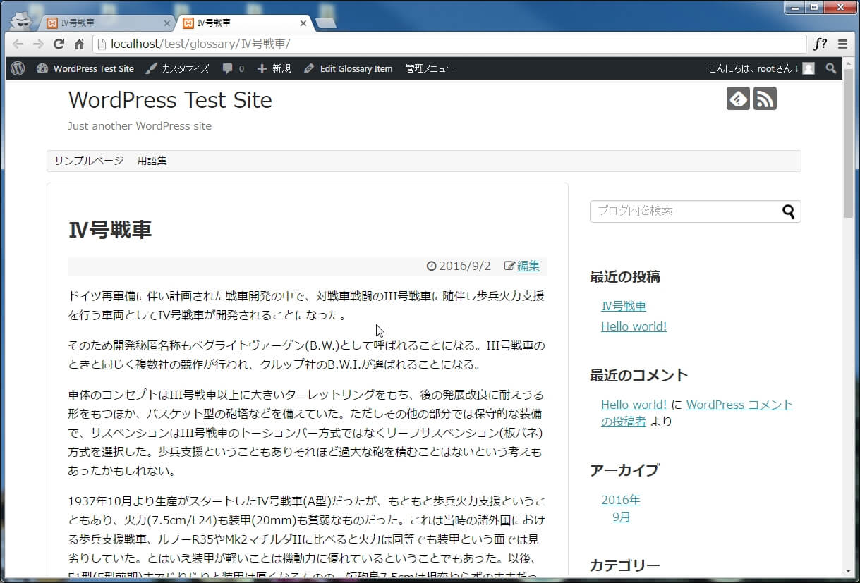 WordPressの固定ページにGlossaryも自動で作成されタイトル真似して用語集としました。パーマリンクの設定も”http://URL/glossary/”になっていることを確認しました