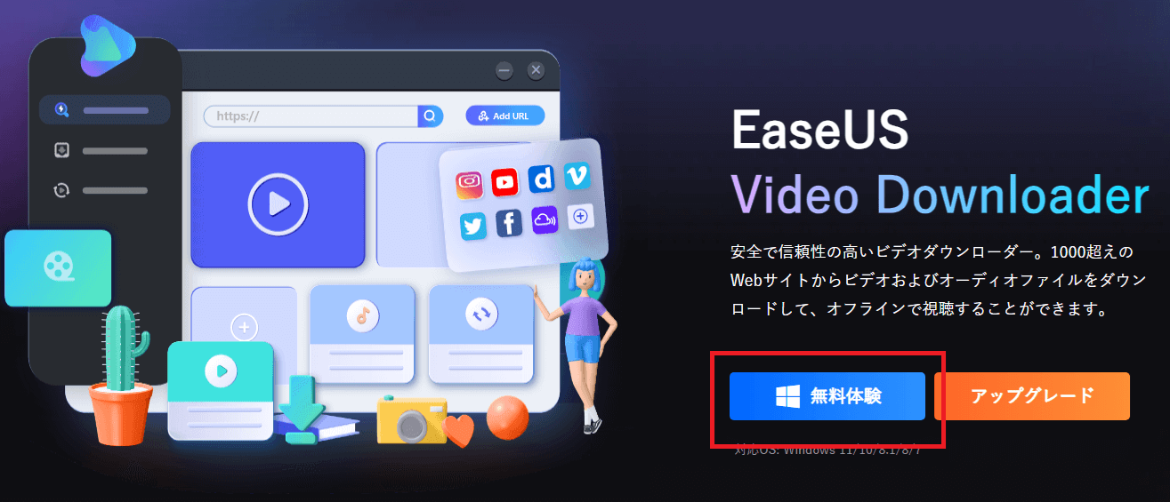 まずは、EaseUS Video DownloaderのWebサイトに行って[無料体験]をクリックしてインストールプログラムをダウンロード。
