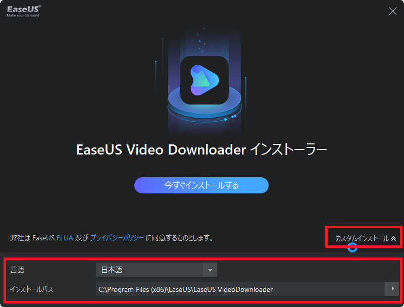 もしインストールフォルダを変更したかったり、表示された言語が日本語じゃなかったら[カスタムインストール]をクリックすれば良いです。