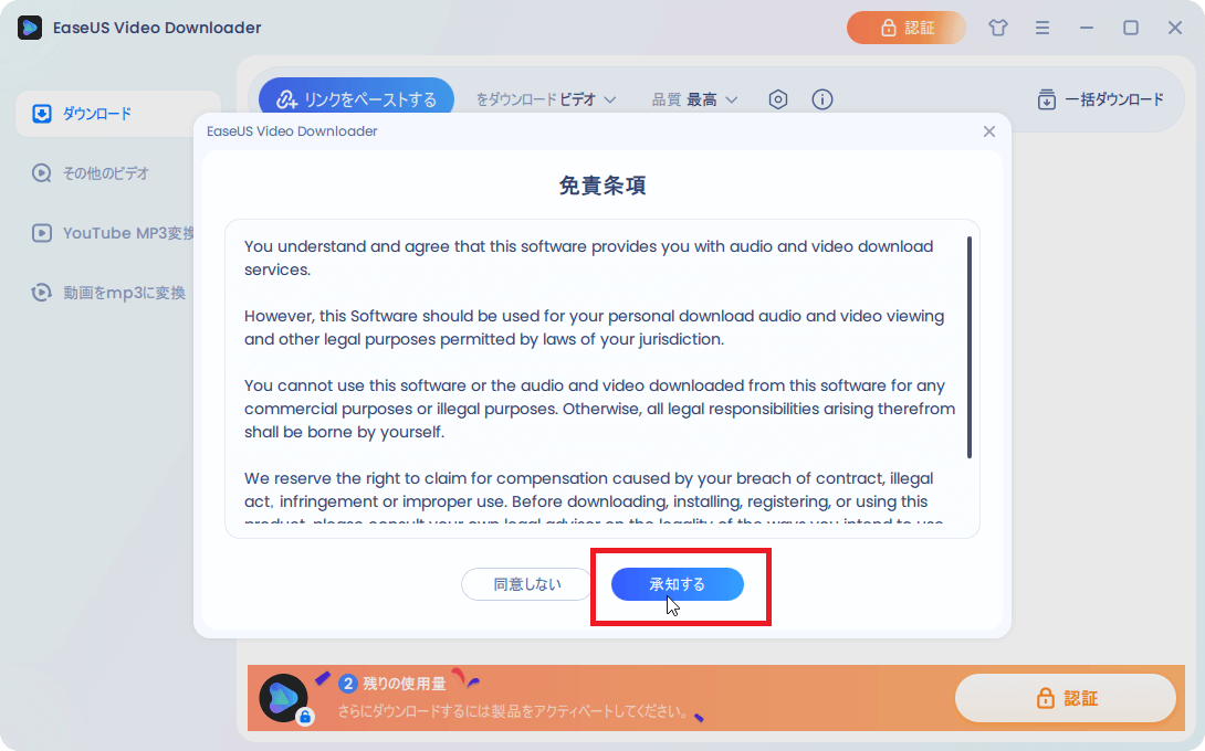 初回起動時のみ「免責事項」画面が表示されますが、[承知する]をクリックしましょう。