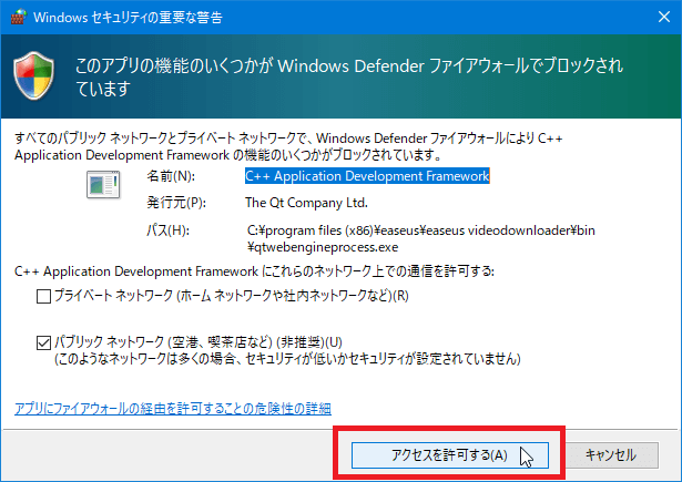 クリックしたあとに「Windows セキュリティの重要な警告」が表示されたら[アクセスを許可する]をクリックしましょう。