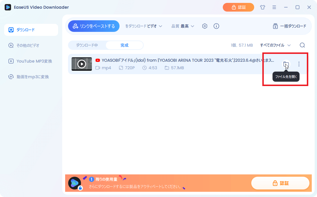 動画の右にあるフォルダアイコンをクリックするとダウンロードされた動画の保存先フォルダが開きます。