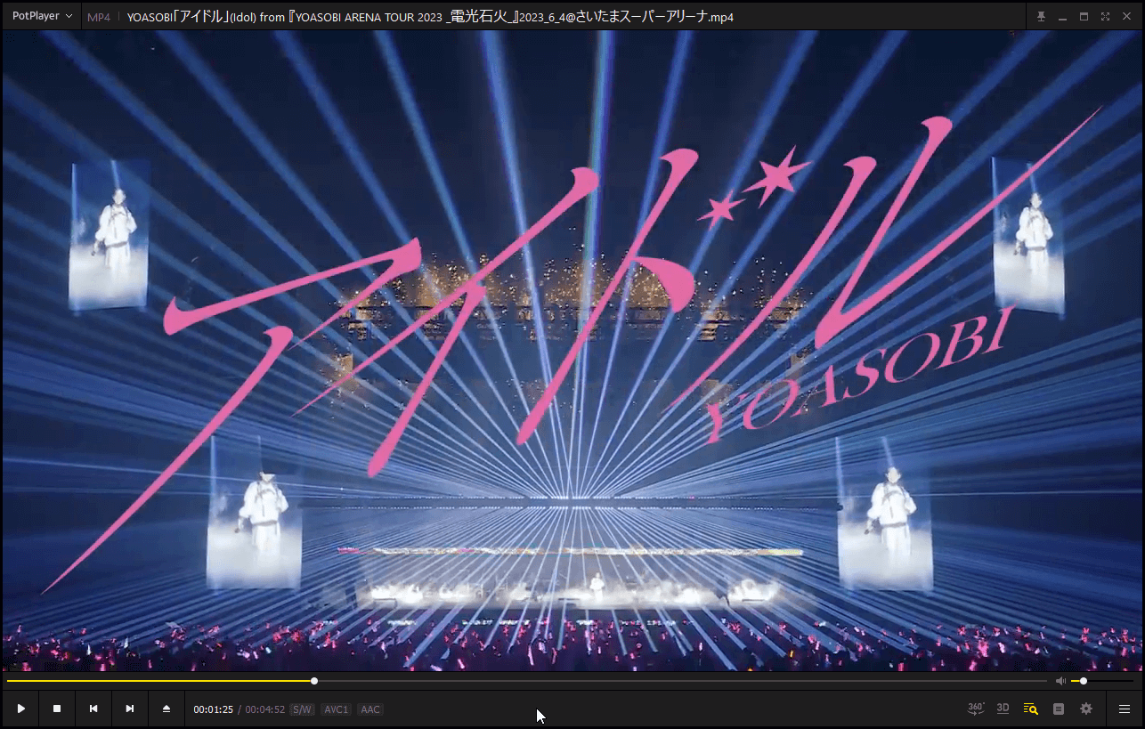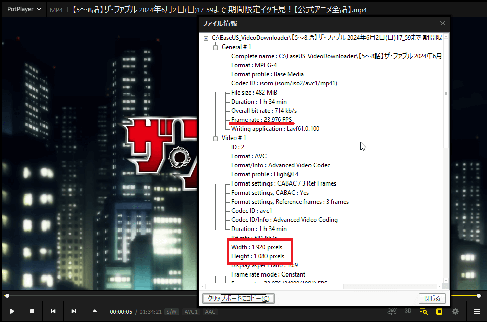 実際ダウンロードして再生した画面ですが、ファイルの情報を調べると1920X1080、フレームレートが23.9FPSという視聴には十分な高画質でダウンロードされています。