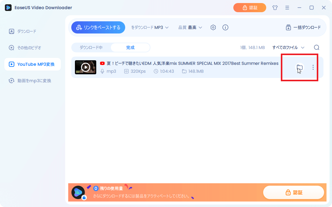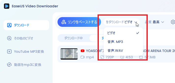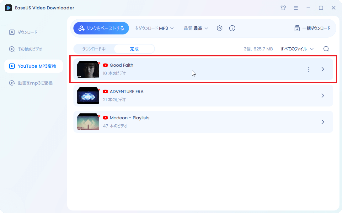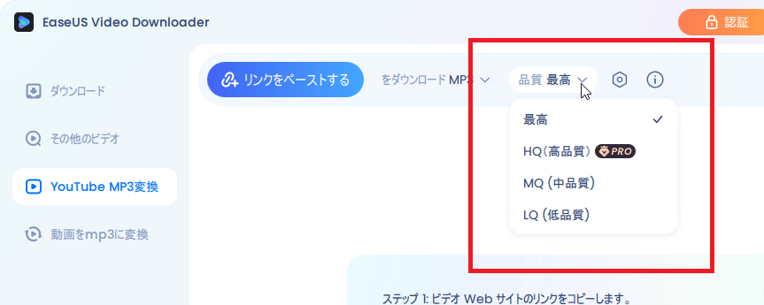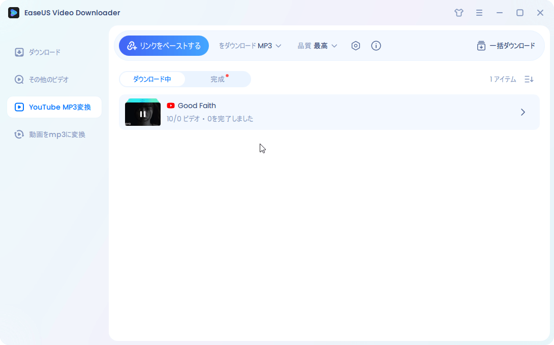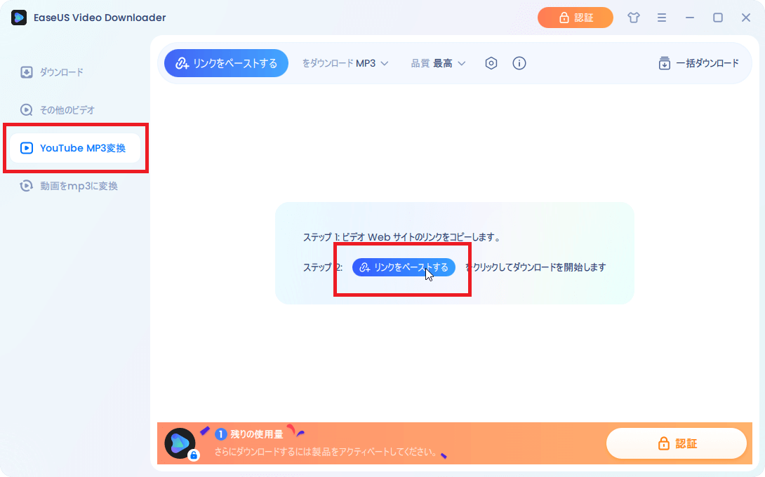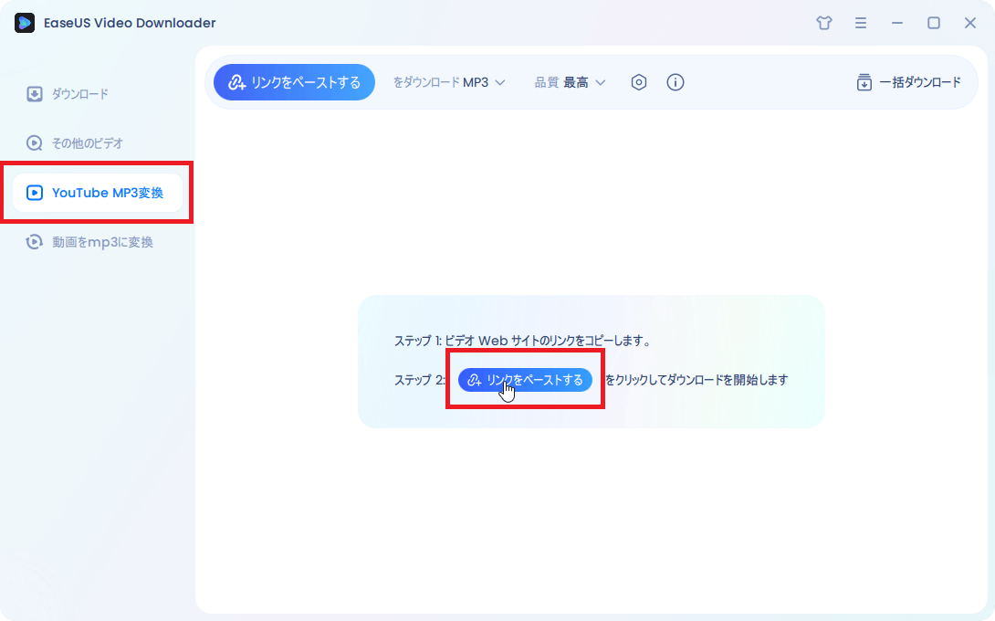 コピーしたらEaseUS Video Downloaderの左メニューから[YouTube MP3変換]を選択して[リンクをペースト]をクリックするだけです。