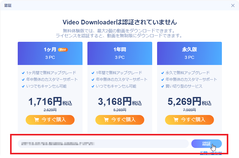 有料版購入後はライセンスをアクティベートする必要がありますので、[認証]ボタンをクリックして、ライセンスキーを入力して[認証]をクリックします。