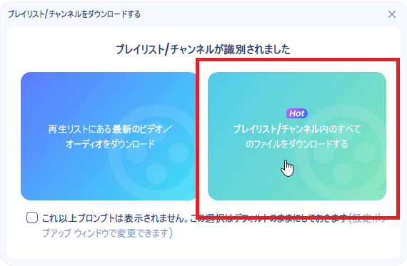 最新の動画のみか、再生リストのすべてをダウンロードするか聞かれるので、「すべてのファイルをダウンロードする」を選択します。