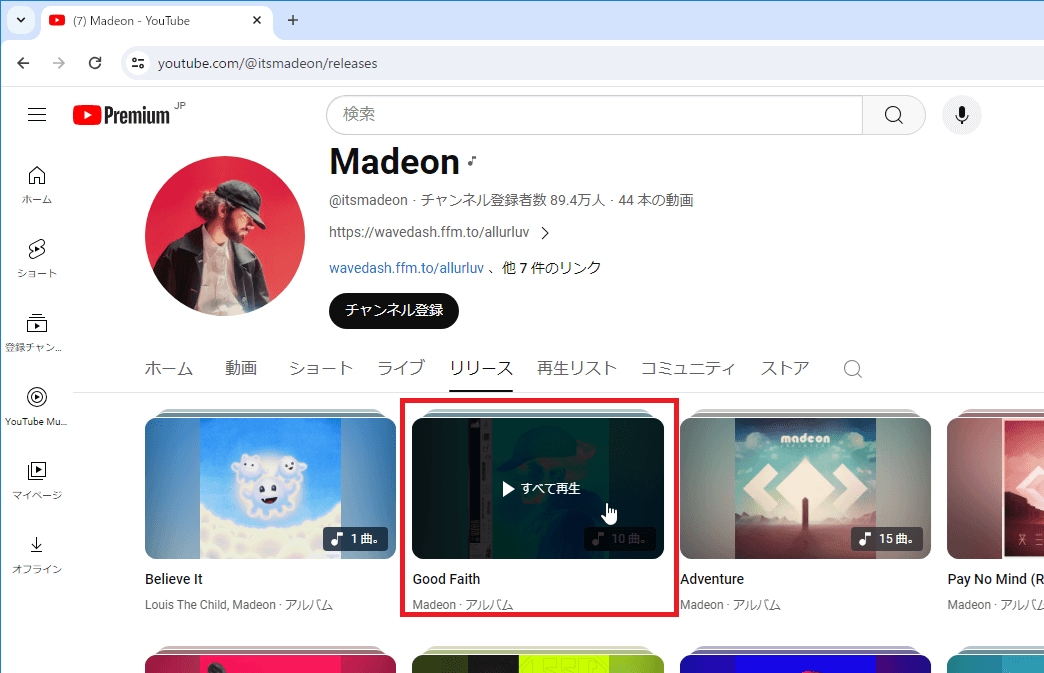 例えば、お気に入りのアーティストのチャンネルの[リリス]タブから音楽ファイルでダウンロードしたい動画リストを開きます。