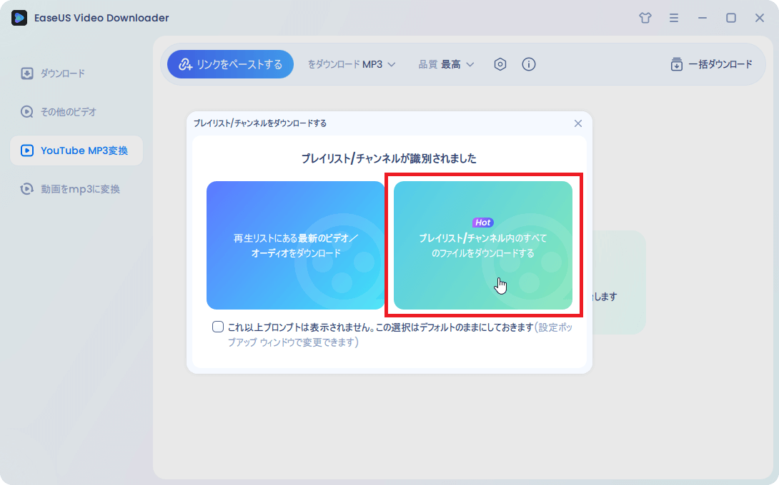 リストの最新の動画ファイルのみか全部の動画ファイルからMP3でダウンロードするか聞かれるので、「すべてのファイルをダウンロードする」を選択します。