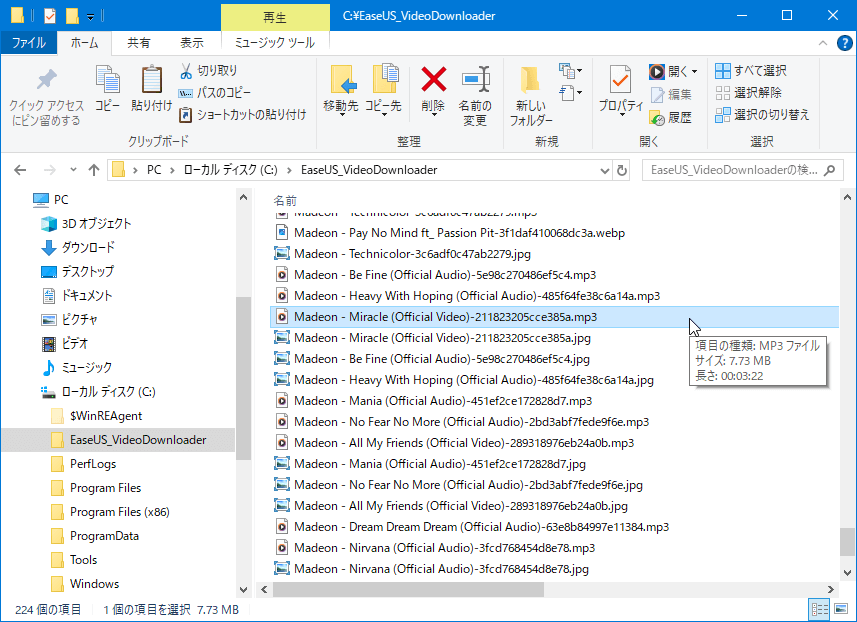 ダウンロードフォルダを見ると、ちゃんとMP3形式でダウンロードされていることがわかります。
