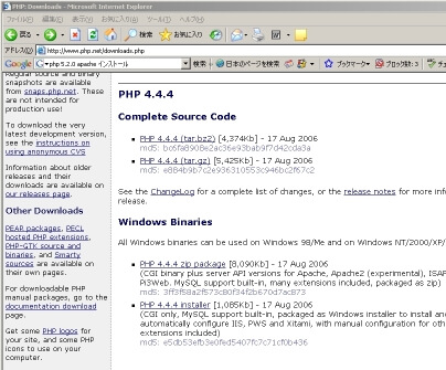 PHPの本家サイトからPHP4.4.4のzipパッケージ(php-4.4.4-Win32.zip)をダウンロードします。
