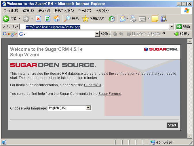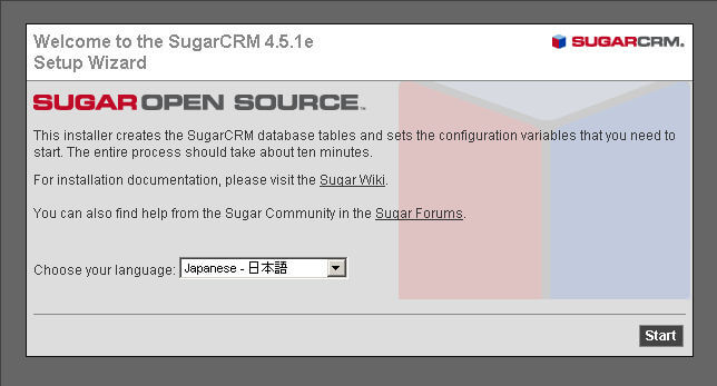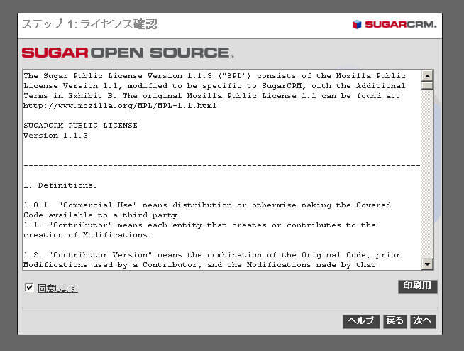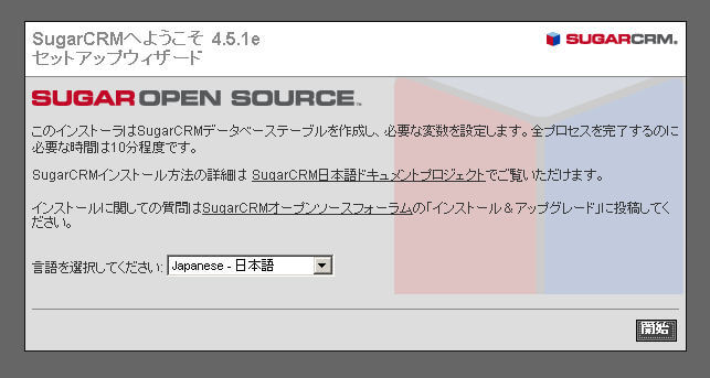 SugarCRMのインストール作業はブラウザからウィザード形式の手順に従って実行していきます。